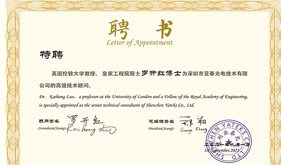 風勁帆滿海天闊,牽手闊步新征程!2021年9月1日,深圳市亞泰光電技術有限公司特聘英國倫敦大學教授、皇家工程院院士羅開紅博士為高級技術顧問。亞泰光電總經理鄭翔為羅開紅博士頒發了聘書。