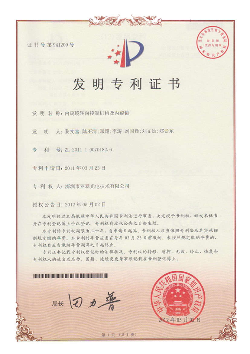 亞泰光電首頁  >>  走進亞泰  >>  亞泰光電資質榮譽  >>   發明專利  >>  內窺鏡轉向控制機構及內窺鏡