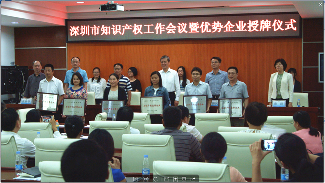此次參會領導有深圳市市場監(jiān)督委員會常務副主任范鳴春、深圳市知識產權局副局長秦世杰、深圳市知識產權局知識產權促進處處長陳民鋼、副處長宋洋等。會議內容包括2014年度知識產權優(yōu)勢企業(yè)授牌儀式、最新知識產權政策宣貫以及知識產權促進工作部署等。會上,范主任做了重要講話,充分肯定了深圳市知識產權工作在過去30年取得的矚目成績,2014年專利申請量連續(xù)四年全國第一,PCT申請量占全國一半;發(fā)明專利擁有量75件/萬人,是全國平均水平的15倍以上;90%以上的研發(fā)機構、研發(fā)人員、研發(fā)投入、研發(fā)成果均來自企業(yè)。未來“十三五”規(guī)劃中,深圳市將在知識產權保護、運營以及人才培養(yǎng)方面繼續(xù)推出新政策,將深圳打造為國際型創(chuàng)新城市“中國硅谷”。同時也指出了深圳市知識產權工作的不足:知識產權分布結構不均衡,與發(fā)達國家發(fā)達城市依然存在差距等。