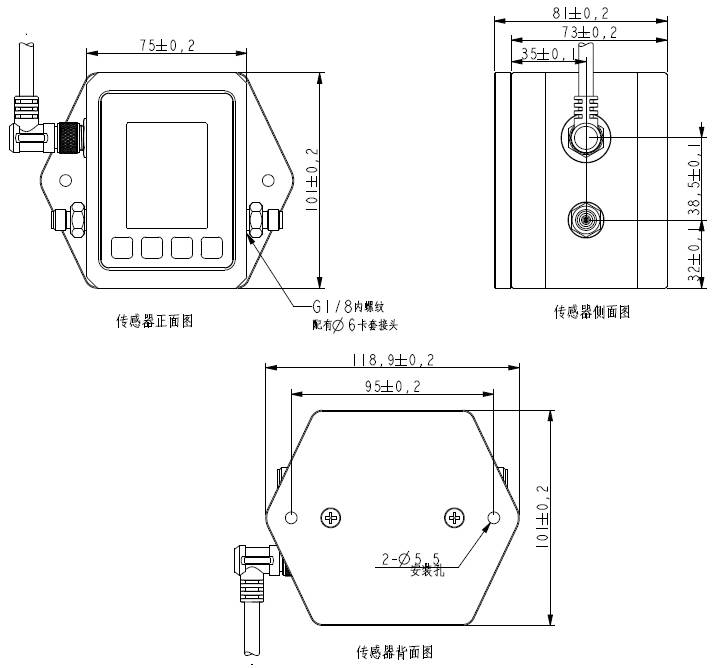 傳感器機箱的外形以及安裝孔尺寸圖 單位:mm