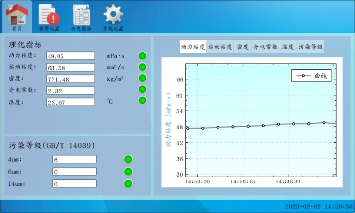 本軟件為“在線油液質(zhì)量監(jiān)測(cè)系統(tǒng)”,用于實(shí)時(shí)監(jiān)測(cè)油液的各種油品狀態(tài)指標(biāo),如動(dòng)力粘度、運(yùn)動(dòng)粘度、密度、介電常數(shù)、溫度、污染度,以曲線圖規(guī)律性展示,并記錄保存,給用戶對(duì)油液的狀態(tài)提供參考。