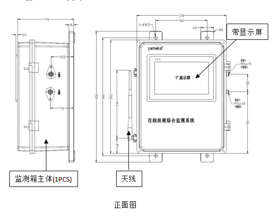 監測箱內部結構組成:磨粒傳感器+清潔度傳感器+含水率傳感器+粘度傳感器+微量水傳感器+介電常數等,用戶可根據不同需求進行功能選配。監測箱外觀結構組成:監測箱主體(1PCS)+掛墻固定板(2PCS)+天線。